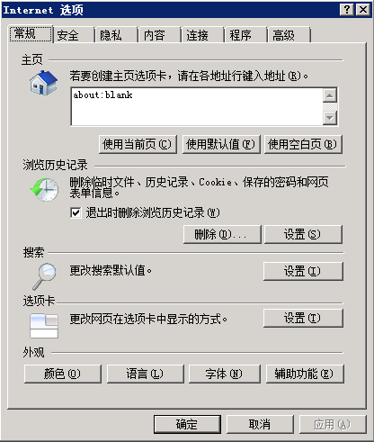 IE8浏览器下点击工具--Internet选项,打开Internet选项,显示如图: