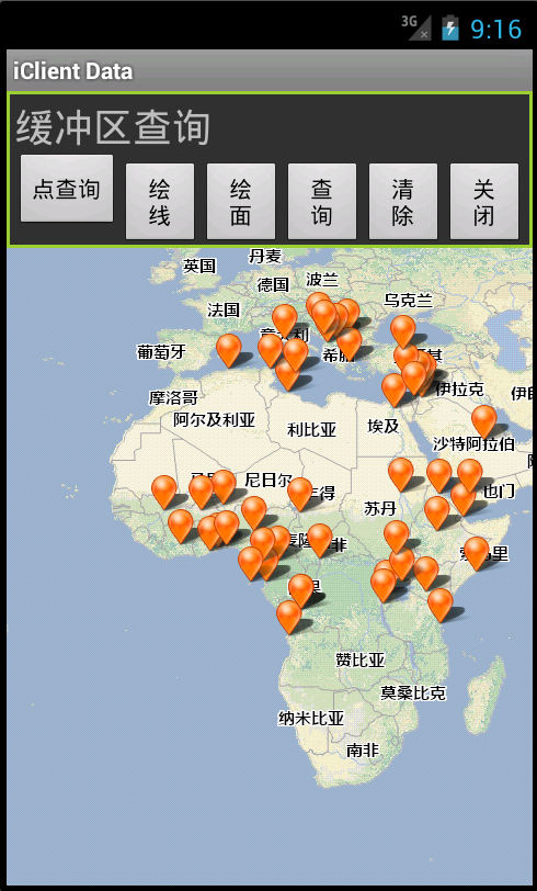 使用的地图实例地址为 /map-world/rest/maps/World,数据分析实例地址为 /data-world/rest/data。点击移动设备的菜单按钮,可选择“ID查询”、“几何查询”、“缓冲区查询”、“SQL查询”等菜单。