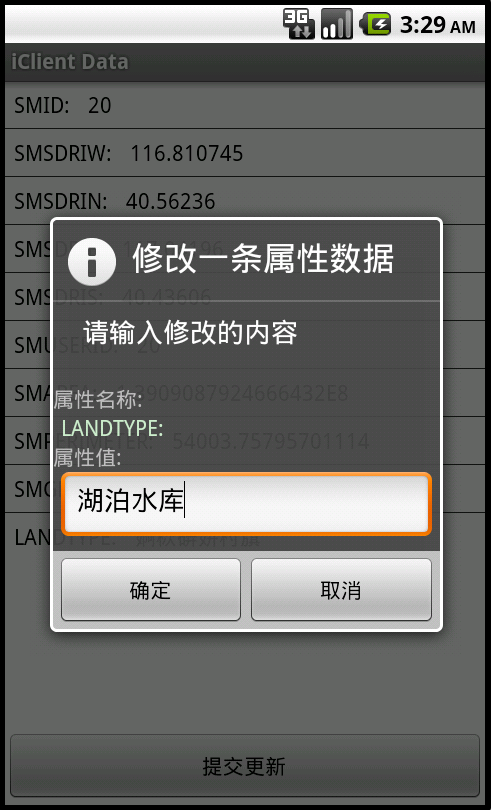 使用的地图实例地址为 /map-jingjin/rest/maps/京津地区土地利用现状图,数据分析实例地址为 /data-jingjin/rest/data。点击移动设备的菜单按钮,点击“地物编辑”,弹出“地物编辑”对话框。数据编辑的图层为“Landuse_R@Jingjin”。