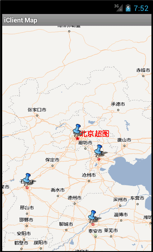浏览示范代码里写出的注记,本例中包括一个点标识和文本注记,显示为“北京超图”,如下图。
