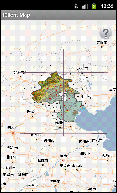 点击进入后,依次在管理菜单中点击地图叠加 > 添加地图服务,在弹出的对话框中输入服务地址(http://serverIP:8090/iserver/services)并确定,会弹出服务器上的所有地图服务列表,选择并长按需要叠加的地图,弹出添加当前地图服务的按钮,点击即可将选择的地图添加到地图视窗中。地图叠加功能支持动态投影,会将待添加的地图动态投影到原有地图相同的坐标系下显示。下图为地图“China”和“京津地区土地利用现状图”叠加效果,