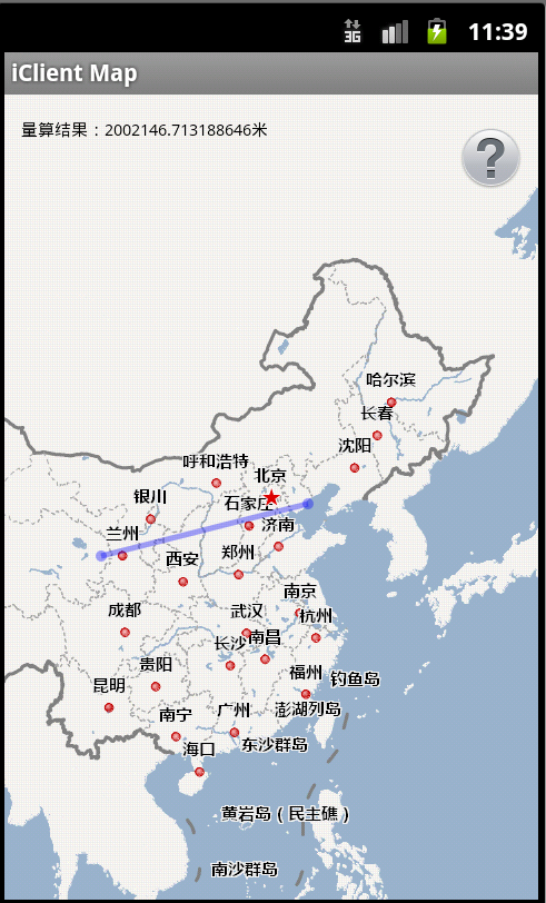 点击进入后,选择距离量算,在屏幕上绘线,量算结果在屏幕上方显示。以距离量算为例,如图: