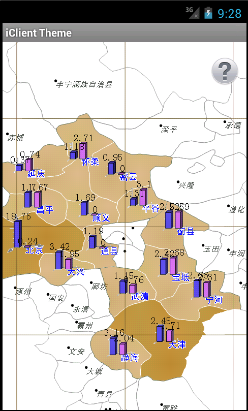 使用地图实例地址为/map-jingjin/rest/maps/京津地区人口分布图_专题图。点击移动设备的菜单按钮,点击“创建专题图”按钮,自定义创建专题图,效果如下图:
