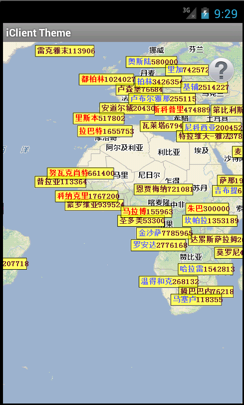 使用地图实例地址为/map-world/rest/maps/World。点击移动设备的菜单按钮,点击“创建专题图”按钮,按照“Pop_1994”字段创建专题图,效果如下图: