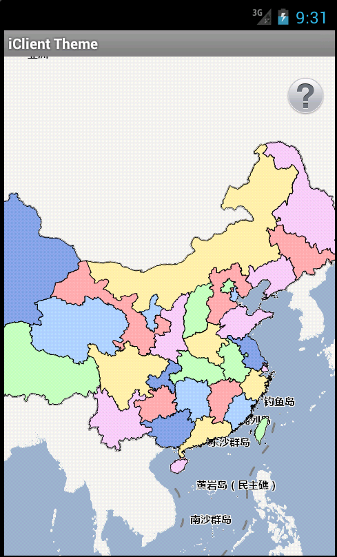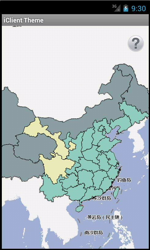 使用地图实例地址为/map-china400/rest/maps/China。点击移动设备的菜单按钮,点击“创建专题图”按钮,按照“SMAREA”字段的等距离分段法创建专题图,效果如下图: