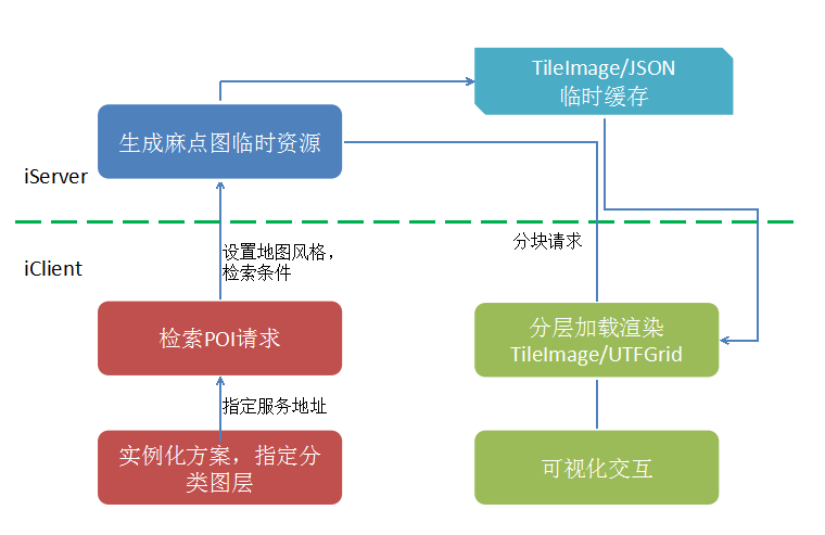 该功能实际上是先调用SuperMap.REST.GetLayersInfoService获取到服务端图层信息,然后修改图层信息,使用SuperMap.REST.SetLayersInfoService设置图层信息创建临时图层,再使用SuperMap.Layer.TiledDynamicRESTLayer将该临时图层在客户端渲染出来。到这一步,大数据量的点就通过瓦片图片的方式在客户端渲染出来了。